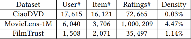 - CiaoDVDs数据集来源于[3]。 在该集合中,默认用户的评分采用等差级数形式(1-5分)。随后,在[7]之后阶段,则采用了二元化处理方法:将评分超过3分的部分标记为1分(即给予正面评价),其余则标记为0分(即不给予正面评价)。这一做法旨在消除同一用户在同一时间点对相同作品产生重复评分的影响,并将所有相关评分类别合并至最早出现的时间点。