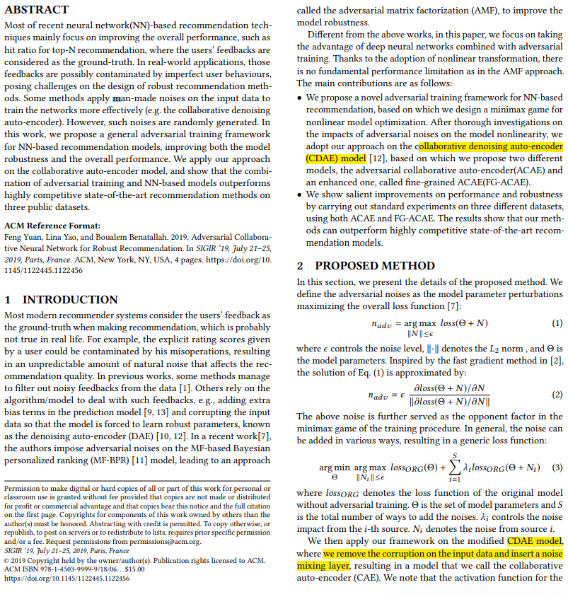 大多数现代推荐系统将用户的反馈视为的基本事实,这在现实生活中可能并非如此。 例如,给出显示评级分数的用户可能会被他的错误操作污染,导致在不可预测的自然噪音中,影响推荐质量。 在以前的工作中,一些方法管理过滤掉数据中的噪声反馈[1]。 另一些依靠算法/模型来处理这样的反馈,例如,添加额外的预测模型中的偏置项并破坏输入数据,使得模型被迫学习健壮的参数,已知作为去噪自动编码器(DAE)。 在最近的一项工作中,作者对基于MF的贝叶斯算法施加了对抗性噪音的个性化排名(MF-BPR)模型,导致一种方法称为对抗矩阵分解(AMF),以改善