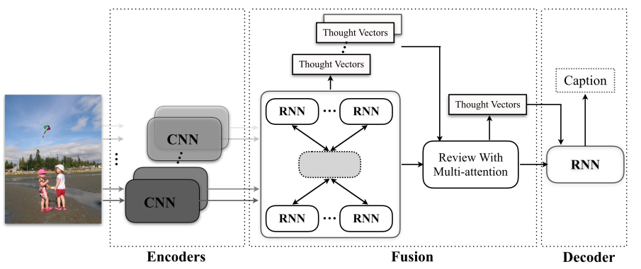 循环融合网络(RFNet),基于多个图像表示间的综合信息来进行图像标题生成。在RFNet架构中,默认情况下其编码器和解码器间存在一种循环反馈机制。该反馈机制划分为两个主要环节,在第一个环节中系统主要基于吸收其他图像表征所携带的多模态特征,并对每个输入样本进行压缩处理;随后第二个环节则对上一阶段所得的结果进一步浓缩为一组新的思维向量,并将其作为解码器注意力机制处理的对象。