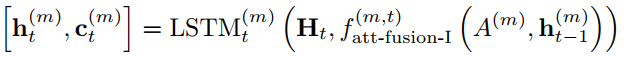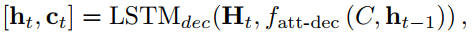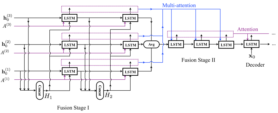decoder 解码模块负责将融合过程产生的信息转化为自然句 初始隐藏状态与存储单元直接来源于融合阶段2的最后一个步骤