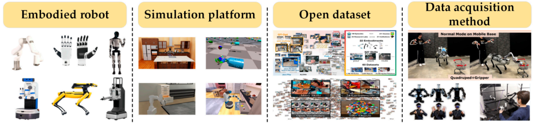 机器人领域集成了人工智能、机器人学和认知科学,是一个感知,理解,决策和执行的端到端的过程,近年来,以互联网规模数据训练得到的预训练模型在感知、交互和推理方面得到显著提升,将它们作为具身抓取和操作方法的基座,极大推动了机器人应用领域的发展。在本文中,我们对该领域最新进展进行全面综述。首先总结具身基础 ,包括前沿的具身机器人、仿真平台、数据集和数据获取方式,以充分了解研究重点,然后介绍具身算法,从预训练模型 开始,到三个主要研究目标,1)具身感知 ,利用视觉传感器捕获的数据,得到3D特征或进行三D重建,结合预训练模型,来理解目标物体和外部环境,直接预测执行动作;2) 具身策略 ,在模仿学习中,利用预训练模型进行数据增强或作为特征提取器增强模型的泛化能力,在强化学习中,通过预训练模型得到最优奖励函数,提升强化学习的学习效率和能力;3)具身代理 ,预训练模型采用分层执行或整体执行的方式实现端到端的机器人控制。