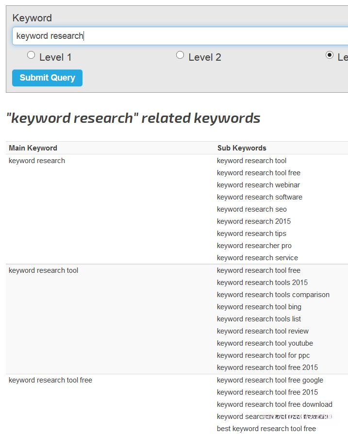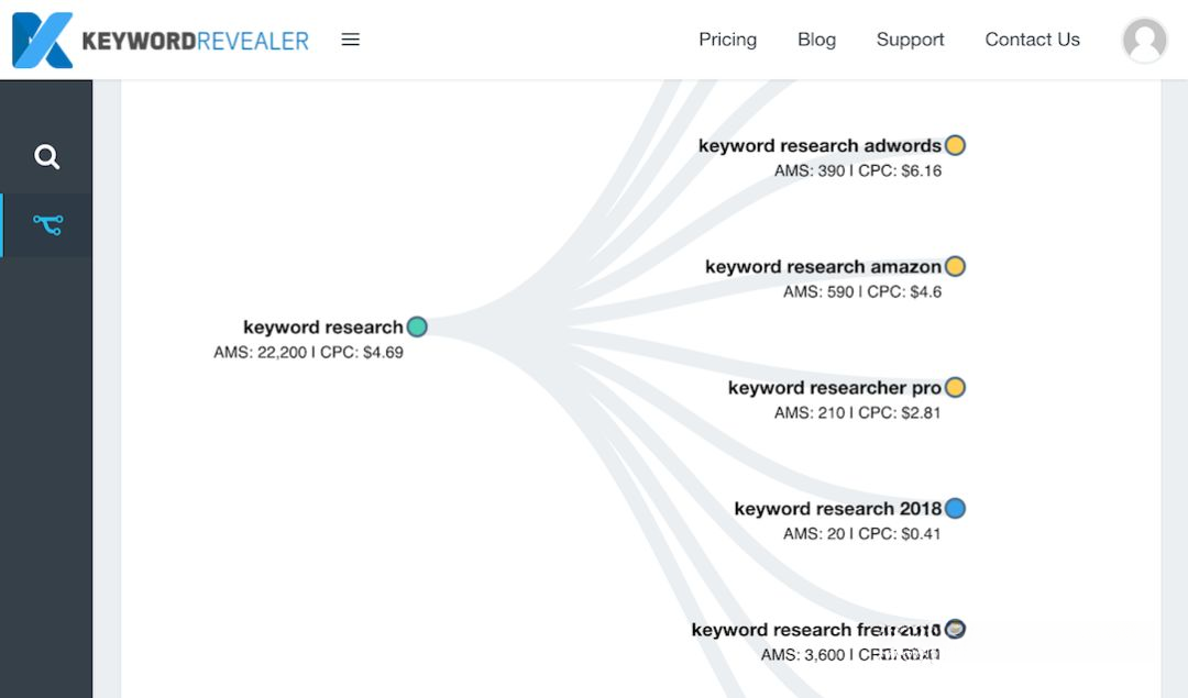 一个标准的SEO 关键词搜索工具,其结果以树状图的形式出现。