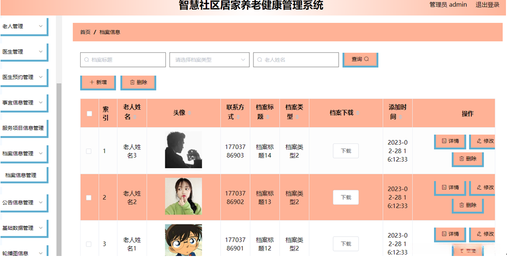 此页面可供管理员使用的功能包括:老人信息查询管理模块;支持删除、修改以及新增老人信息记录;同时具备基于用户名称的部分匹配 querying功能