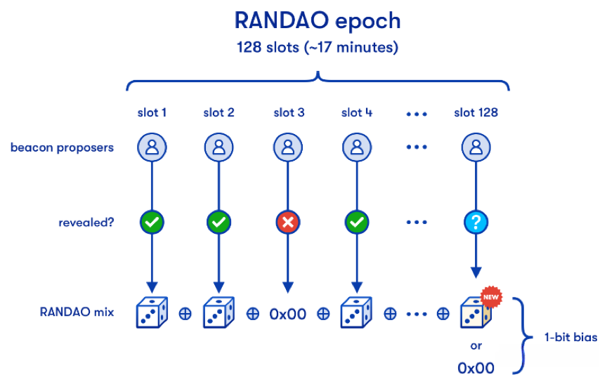 以太坊的方案是使用RANDAO+VDF提供随机数,以实现随机性。把RANDAO拆解成RAN(random)和DAO就很易理解,它是指一群人中的每个人都独自提出一个随机数,再把所有人的随机数合在一起生成最后被使用的那个随机数。因为任何人都难以知道其他人提供的数字,也就难以预知合起来的最终数字。
