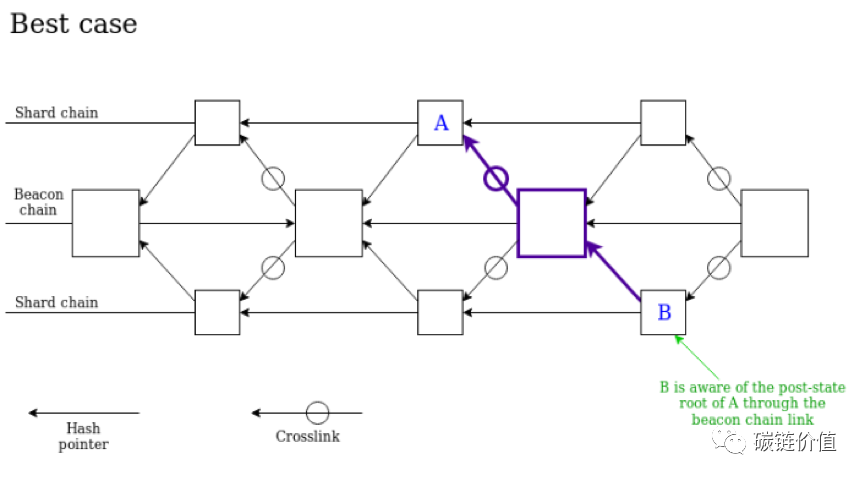 这种方法减少了跨分片交易的等待时间,但提高了对信标链的要求,信标链需要为所有分片存储证明数据;这种方法还增加了交联的链接数量(原设计为每个epoch ,也就是6.4分钟、32个区块交联一次),这必然增加各种相关开销,也因为如此,以太坊的分片数量从1024片改为了64片,从另一个设计方向上减少总的链接数量。(该架构的详细介绍见参考资料6)