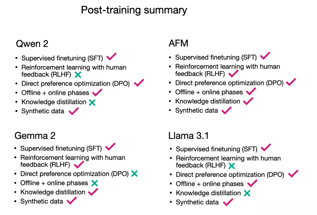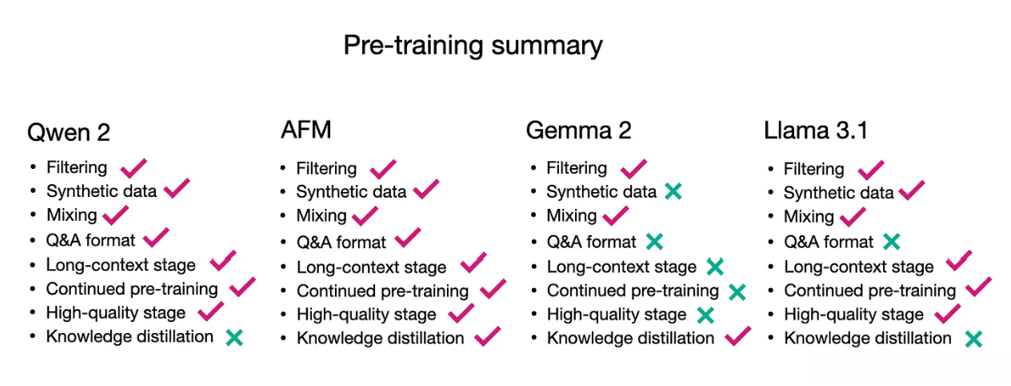 这四个模型在预训练和后培训过程中采用了稍有差异的方法。值得注意的是尽管这些方法论存在重叠但没有任何一个具体的培训流程是完全相同的。就预培训而言其共同点在于采用了多阶段预训练策略其中核心部分通常是经过核心预训练后进行上下文扩展有时还会加入高质量的降温步骤如图所示清晰展示了各模型在这一环节的具体应用情况。
