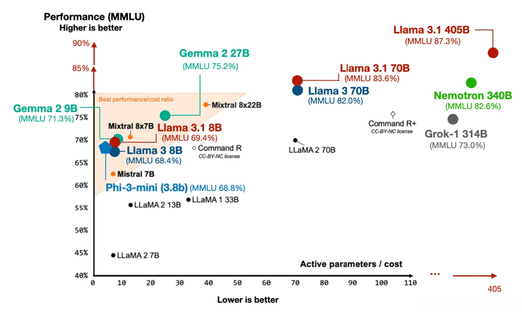 除了推出一个具有4050亿参数的模型之外,Meta还对之前的80亿和700亿参数模型进行了优化,并使其在MMLU性能上有所提高