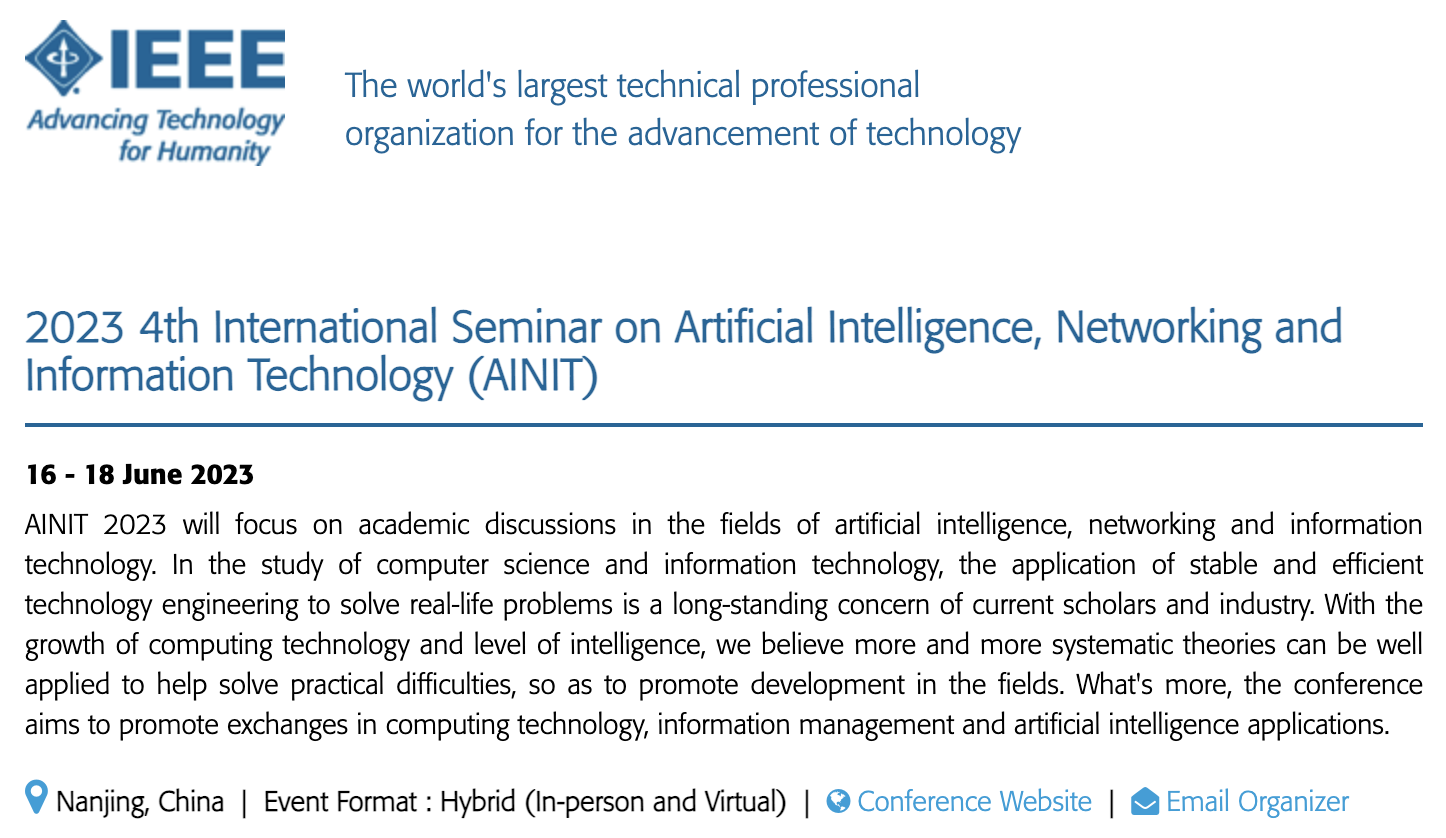 【南京理工大学主办|IEEE出版】第四届人工智能、网络与信息技术国际学术会议(AINIT 2023)