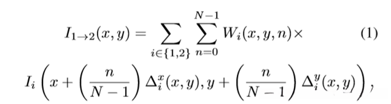 首先探讨“line prediction”层的概念,则其核心观点在于多数情况下一张照片产生的运动模糊呈现出线性特性。为此我们假设已知模糊方向Δ后,则每个输出像素点与输入两个清晰度层在相同方向位置处的灰度值按权重相乘得到。具体而言在此方向上均匀采样N个采样点而通过这些采样点构建出的新图像具有相应的分辨率