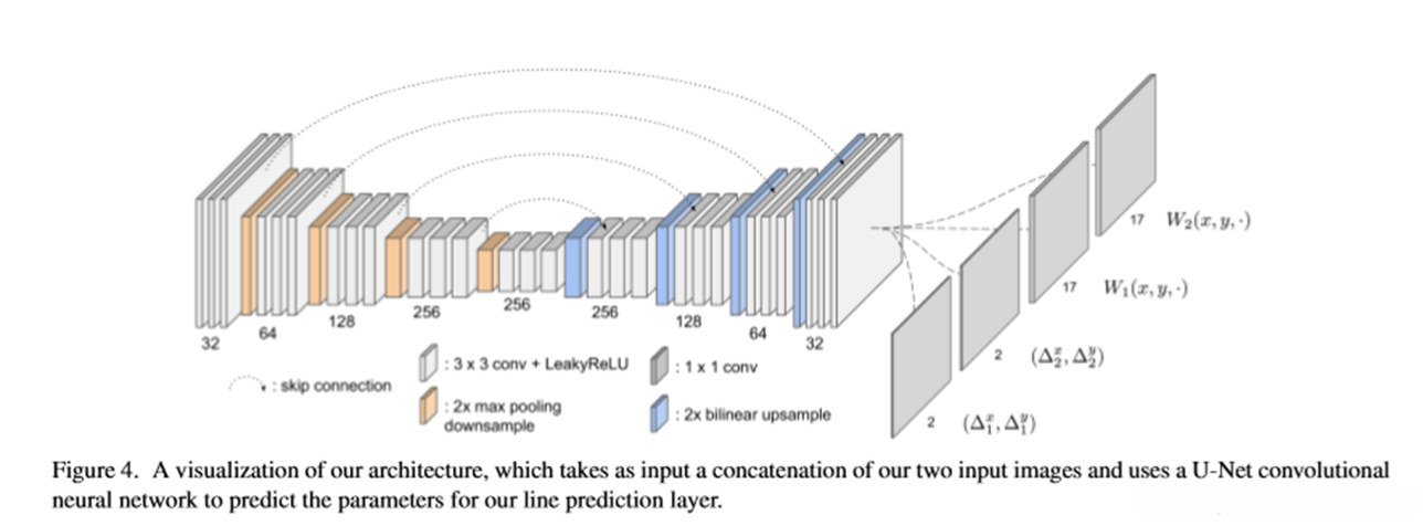 由该网络生成权值与方向。将两张输入图像进行拼接后作为输入。采用U-Net架构。经过最后一层使用1×1卷积操作生成预测输出。