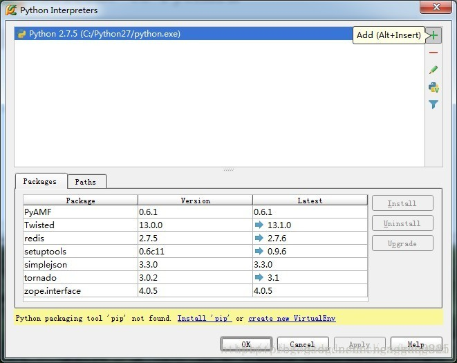 3. 选择python解释器。可以看到,一旦添加了python解释器,pycharm就会扫描出你已经安装的python扩展包,和这些扩展包的最新版本。(估计是pycharm连接了pypi)