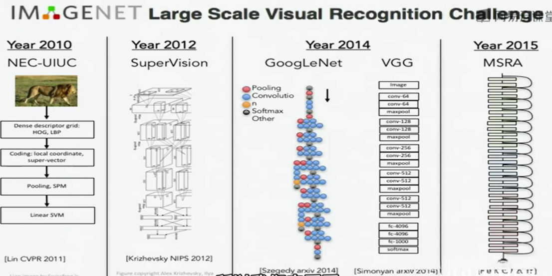 2011年提出的方法仍然是层次化的,它包含了很多分层,首先计算一些特征,然后计算局部不变特征,一些池化操作,在经过多层处理,最终将结果描述符传递给线性SVM,这里的结构仍然是层次结构,我们仍然检测边界,仍然有不变特征的概念,所有这些直觉信息都会在卷积神经网络中使用。但2012年才是真正的突破,Krizhevsky和他的导师提出了卷积神经网络,创造了7层卷积神经网络,并在2012年的比赛中夺得了冠军;而在这之前,一直都是特征+支持向量机的结构,一种分层结构;而在这之后,获得冠军的算法都是卷积神经网络。2015年vgg网络,那时有19层,到2015年更加疯狂,有一个残差网络(ResNets),152层,从此以后性能得到一点提升,只要能将层数增加到200以上,不过也有可能造成Gpu内存溢出。
