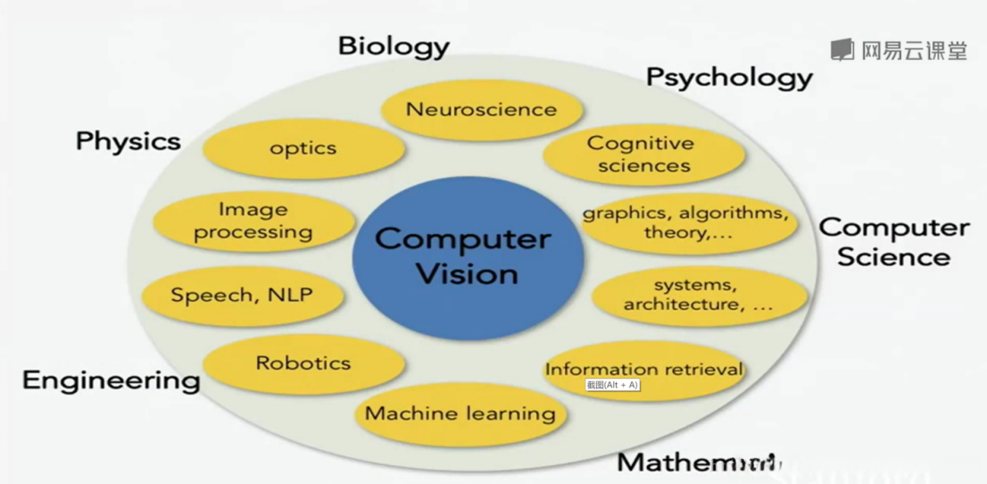 计算机视觉是一个与很多领域紧密关联的学科,它涉及到比如说工程、物理、生物等许多不同的领域:
