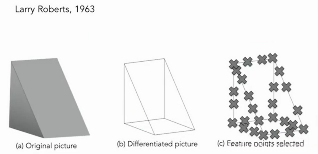 计算机视觉的历史是从60年代开始,从Larry Roberts的计算机视觉的第一篇博士论文开始。其中视觉世界被简化为简单的几何形状,目的是能够识别他们,重建这些形状是什么。