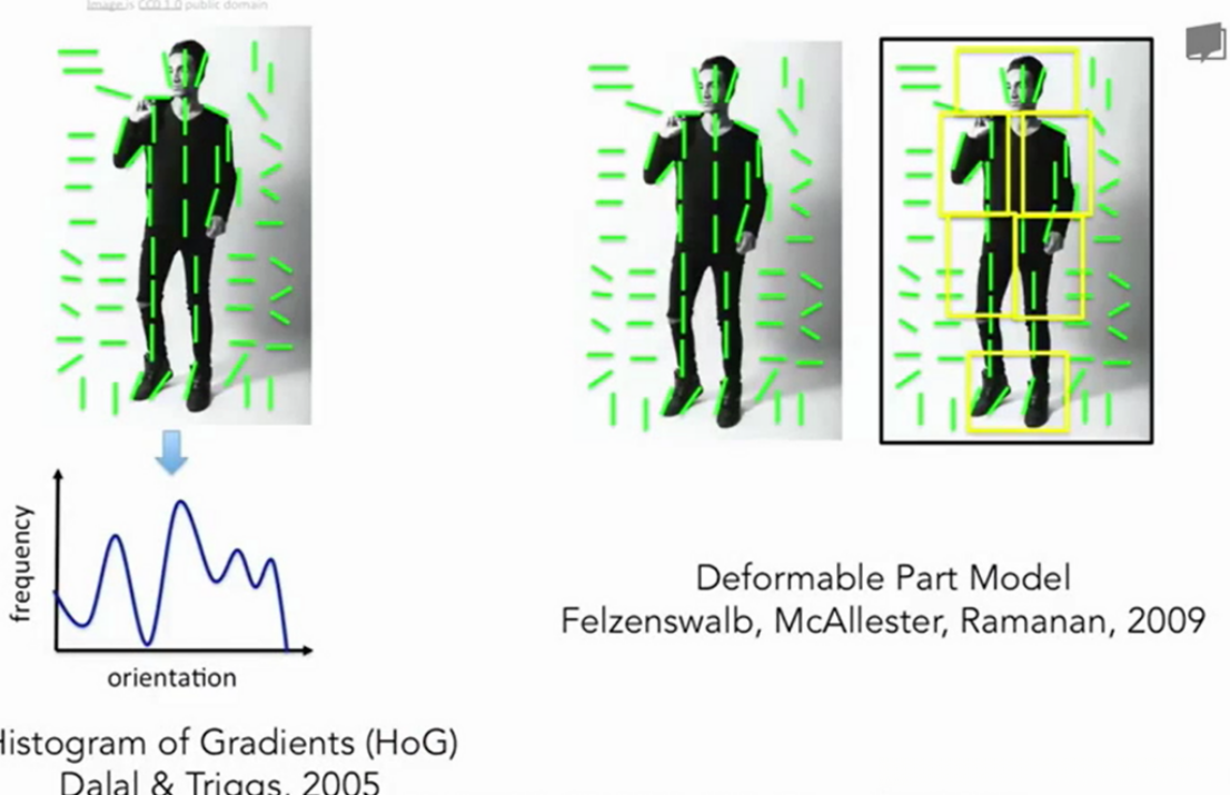 有些工作是把这些特征放在一起以后,研究如何在实际图片中比较合理地设计人体姿态和辨认人体姿态,这方面一个工作被称为“方向梯度直方图”,另一个被称为“可变部件模型”。