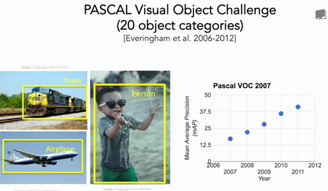 所以,从60年代、70年代、80年代一直到21世纪,图片的质量随着互联网的发展,计算机视觉领域也能拥有更好的数据了。直到21世纪早期,才开始真正拥有标注的数据集能够衡量在目标识别方面取得的成果,其实一个最著名的数据集叫做PASCAL Visual Challenge。这个数据集有20个类别,数据集的每个种类有成千上万张图片。