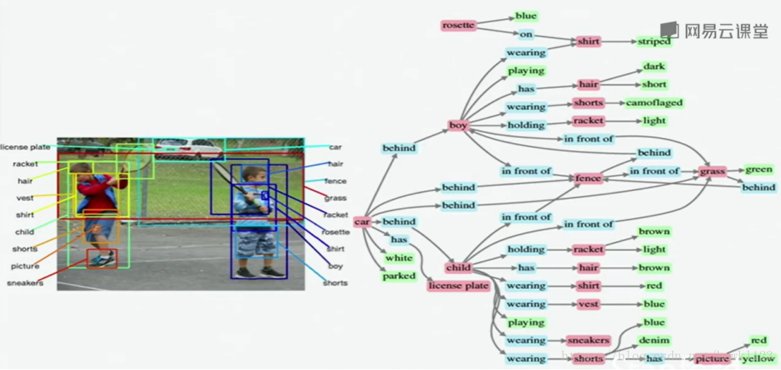 实验室有个数据集叫做视觉基因组,与简单的“在物体上贴标签”比起来,我们往往希望深入地理解图片中的人们在做什么、各个物体之间的关系是什么,于是我们开始探究物体之间的联系,这是一个被称为视觉基因组的项目。在显示生活中捕捉错综复杂的事,而不仅仅是框定出物体,我们应该描述出图像,作为整个大图像语义相关的概念,而不仅包括对象的身份,还包括对象关系,对象属性,以及场景中发生的动作,这种表达可能允许我们使用简单分类去捕捉一些丰富的视觉世界中唾手可得的事情,这绝不是一种标准的方法。