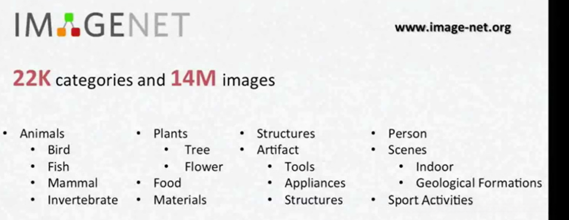 与此同时,提出了一个重要的问题:是否具备了识别真是世界中的每一个物体的能力或者说大部分物体。这个问题也是由机器学习中的一个现象驱动:大部分的机器学习算法,无论是图模型还是SVM、AdaBoost都可能会在训练过程中过拟合。因此,有这两方面的动力,一是单纯想识别自然界中的万物,二是要回归机器学习克服瓶颈—过拟合问题,开始开展了一个ImageNet的项目,汇集所有能找到的图片,组建一个尽可能大的数据集。