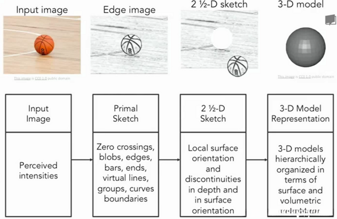 第一个过程就是他所说“原始草图”,大部分边缘、端点、虚拟线条、曲线、边界等都被用其他元素来表示。视觉处理的早期阶段有很多关于像边缘的简单结构,然后,边缘和曲线的下一步是2.5维草图,我们开始将表面深度信息、层或者视觉场景的不连续性拼凑在一起,然后将所有的内容放在一起,并在表面和体积图等分层组织了一个3d模型,这是一个非常理想化的思想过程,也是一个非常直观化的方式并考虑如何解构视觉息。