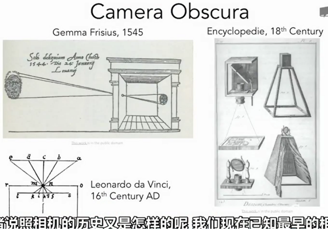 现在知道的最早的相机追溯到17世纪文艺复兴时期的暗箱,这是一种通过小孔成像的相机,这和动物早期的眼睛非常相似,通过小孔接收光线,后面的平板手机信息并且投影成像。