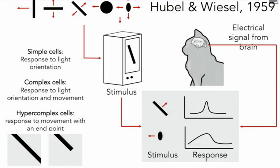 同时,生物学家开始研究视觉的机理,最具影响力并且启发了计算机视觉的一项研究是在五六十年代,休伯尔和威泽尔使用电生理学的研究,他们提出了“哺乳动物的视觉处理机制是怎样的”,通过观察何种刺激会引起视觉皮层神经的激烈反应,他们发现猫的大脑的初级视觉皮层有各种各样的细胞,其中最重要的是当它们朝着某个特定方向运动时,对面向边缘产生回应的细胞。
