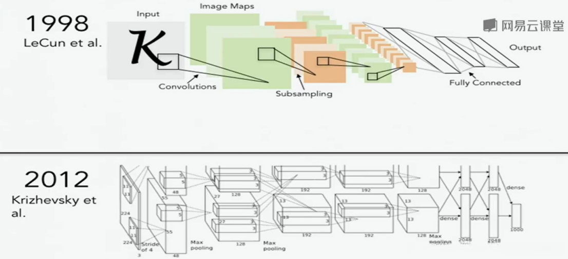 所有既然这些算法在90年代就很突出,为什么到最近几年才变得这么流行呢?从数学的角度来说,有很重要的两点引起了深度学习架构的复兴,一个是摩尔定律,计算能力在变得越来越高;如今有GPU这样的图像处理单元,其具有超高的并行计算能力,非常适合进行卷积神经网络模型这类高强度的计算,另一个是数据,算法需要大量的数据,需要给它们提供非常多的带标签的图像和像素,以便能最终取得更好的效果,有了大数据集,可以实现更强大的模型。