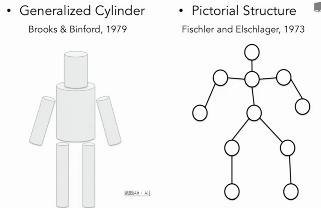 一个被称为“广义圆柱体”,一个被称为“图形结构”,他们的基本思想是每个对象都是由简单的几何图形单位组成,所以任何一种表示方法是将物体的复杂结构简约成一个集合体。例如一个人可以通过广义的圆柱形形状拼接在一起,或者人也可以由一些关键元素按照不同的间距组合在一起,所以任何一种表示方法是将物体的复杂结构简约成一个集合体,有更简单的形状和几何结构。