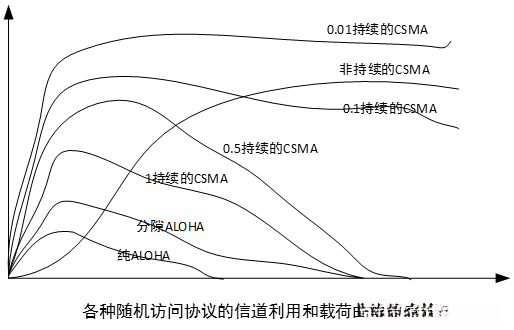 | 载波侦听多路访问协议 | 网络站点侦听载波是否存在(有无传输)并相应动作的协议,被称为载波侦听协议(carrier sense protocol)。 持续CAMA 当站点要传输数据时,首先侦听信道,看是否有其他站点正在传送,如果信道正忙,持续等待直到侦听到信道空闲时,将数据送出。若发生冲突,站点就等待随机长的时间,然后重新开始。 存在问题:信道传输结束后,可能存在两个站点同时检测到空闲,一起传输从而冲突的情况; 非持续CAMA 发送前,站点会侦听信道的状态,如果没有其他站点发送,就开始发送。如果信道正在使用,将不再继续侦听该信道,而是等待一个随机时间后,再重复上述过程。 存在问题:利用率稍高于持续CAMA的同时,时延会略长。 **p-**持续CSMA 用于分隙信道:站点传送之前侦听信道,如果信道空闲,以概率p传送,概率q=1-p将该次发送推迟到下一时隙;如果下一时隙仍然空闲,继续上述过程,一直重复,知道发送成功或信道忙为止。 通过对比信道利用和载荷曲线,可以看出: