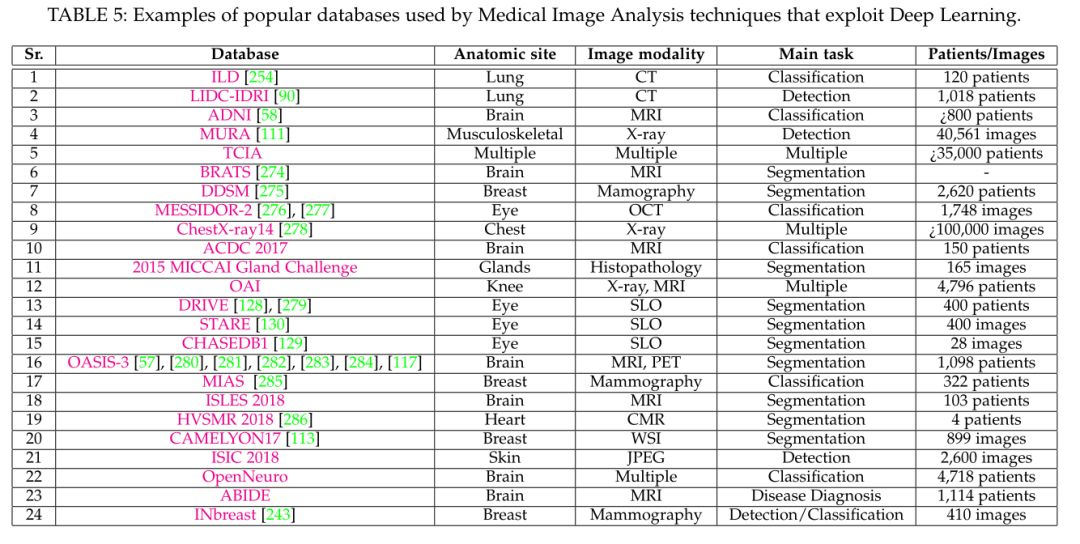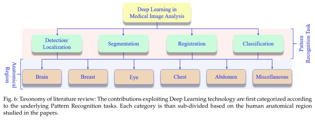 作者根据医学图像分析的不同技术分支及其实际应用领域,并结合所使用的数据集进行分类整理出下图。