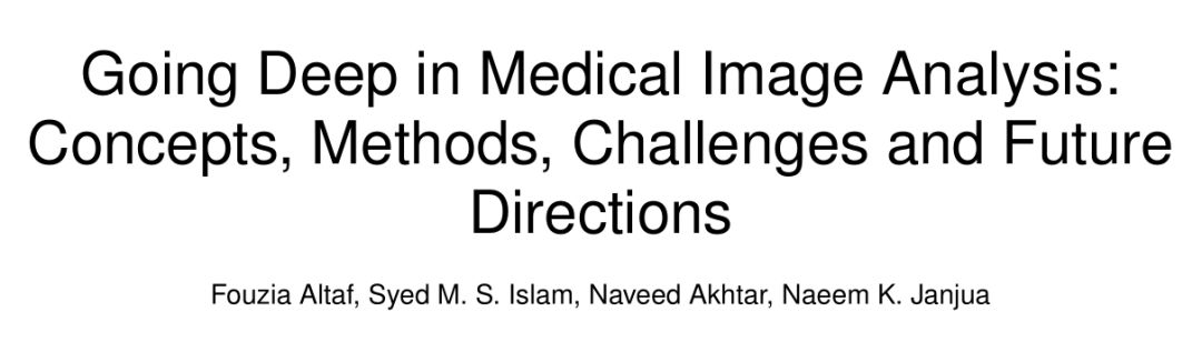 今日在arXiv平台发布了一篇名为《Going Deep in Medical Image Analysis: Concepts, Methods, Challenges and Future Directions》的综述性论文。该研究由澳大利亚埃迪斯科文大学的研究团队完成,并对深度学习在医学图像分析领域的应用概念、当前常用的分析方法及其相关数据集进行了系统性综述,并探讨了当前面临的挑战以及未来的发展方向