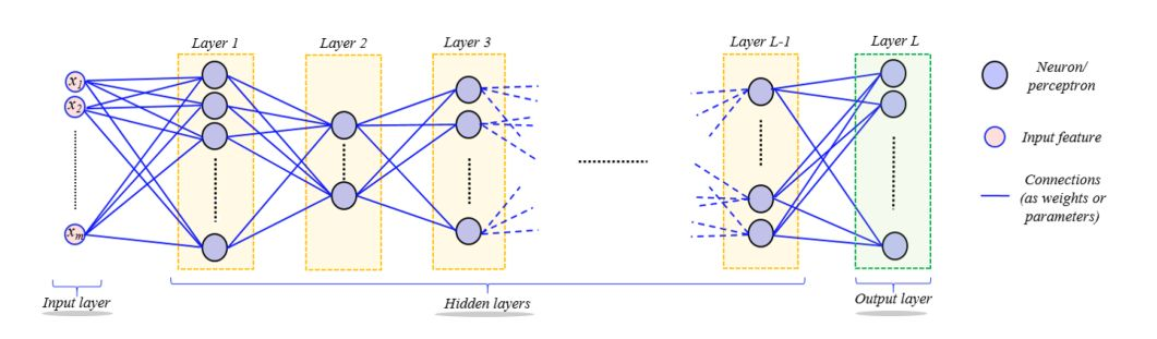深度神经网络架构,包含输入层、输出层,与多个隐含层。