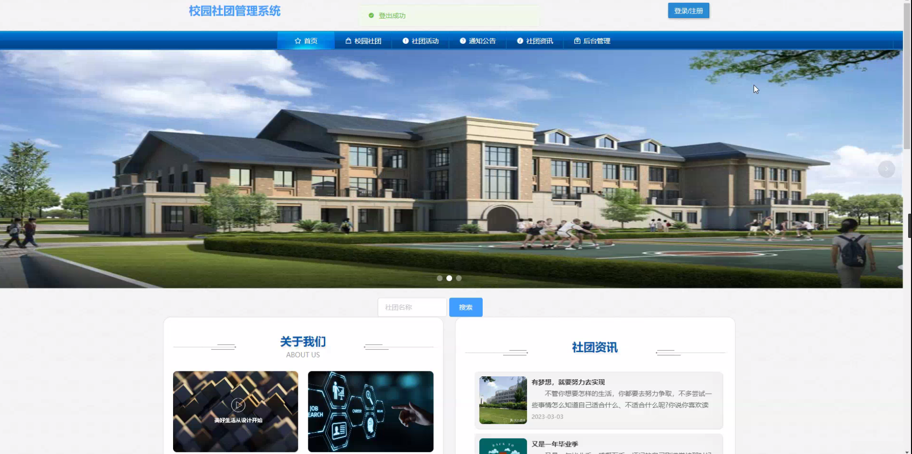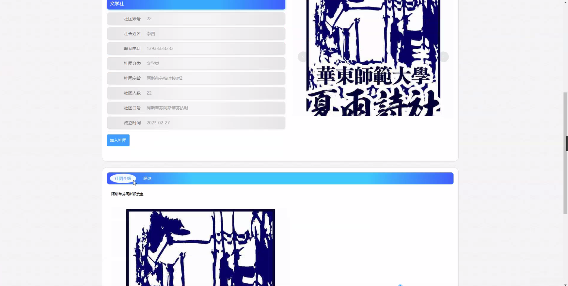 研究意义:校园社团管理系统是实现学生组织高效运作的重要平台,在提升社团运营效率方面发挥着关键作用。通过构建结构化、信息化的管理体系,在保障社团活动质量的同时实现了资源的有效配置,并且显著提升了学生的参与热情与归属感。该系统不仅能够建立一套完善的监管体系来保障活动安全运行,在信息交流方面也实现了从局部到全局的信息共享机制。此外,在数据处理能力方面实现了从简单统计向深度分析转变的功能支撑,并且在提升学生自主管理能力的同时也为学校的决策工作提供了有力支撑