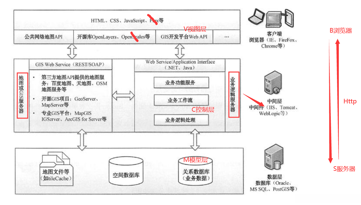WebGIS(网络地理信息系统),即Web+GIS,侠义来说就是基于B/S架构(Browser/Server,浏览器/服务器架构)通过Web浏览器访问的GIS。相对于C/S(Client/Server,客户机/服务器)架构,B/S架构具有部署方便、使用简单、便于推广等优势。