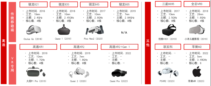 早期 VR 一体机一直在使用移动端芯片,随着 VR 设备出货量逐渐提升,高通推出了 VR 专用芯片。如 Quest 2、Pico 4、爱奇艺奇遇 3、HTC Vive Focus 3 等主流 VR 一体机均采用了高通 XR2 芯片,高通XR2 芯片集成了头部 6DoF 功能,并支持七路并行摄像头、See-through、5G 等功能,是绝对主力芯片。