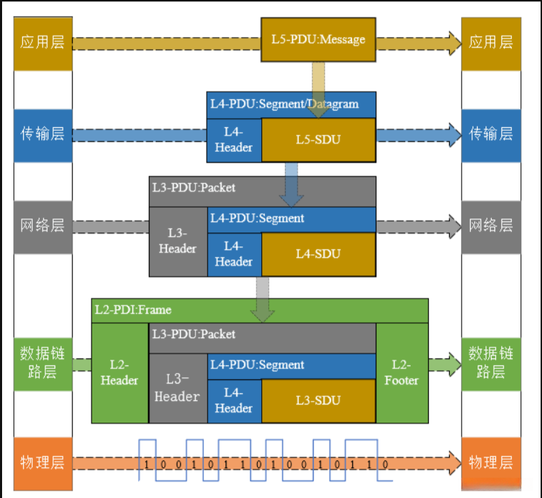 应用层(报文message),运输层(TCP报文段segment或UDP用户数据报datagram), 网络层(IP数据报或分组packet),数据链路层(帧frame),物理层(比特流bit stream)