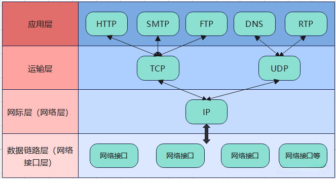TCP/IP体系结构(四层)自顶向下为:应用层、运输层、网际层、网络接口层