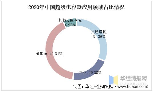 目前超级电容器在新能源客车、轨道交通、智能仪表、电网设备、UPS、港口重型机械、国防军工等领域存在广泛应用。其中,2020年超级电容器在新能源领域应用最广,市场份额为41.31%。其次为应用于交通运输领域的电容器市场占比为31.36%;第三为应用于工业领域的超级电容器市场亿元,占比20.36%。