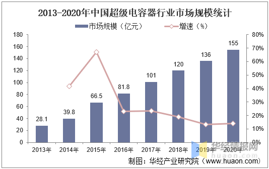 随着下游应用场景的不断扩展,对超级电容器的需求也在不断增长,根据数据显示,2013-2020年我国超级电容器行业市场规模逐年增长,到2020年中国超级电容器市场规模增长至155亿元,同比上升13.97%。未来随着新能源汽车、轨道交通、电力系统等领域的需求推动,我国超级电容器行业将继续保持高速增长。