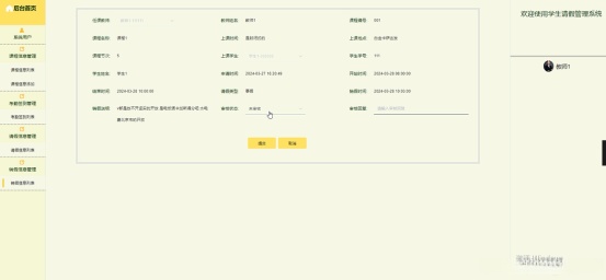 (7)请假信息管理:教师用户可以查看学生的请假申请内容和进行审核。