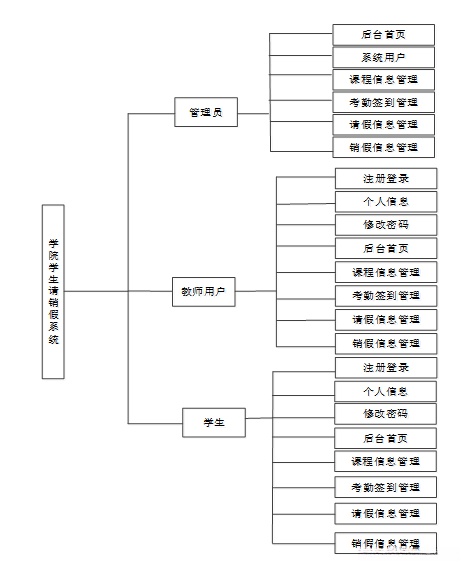 学生请假管理系统从角色上划分为了管理员、学生用户、教师用户三种角色。