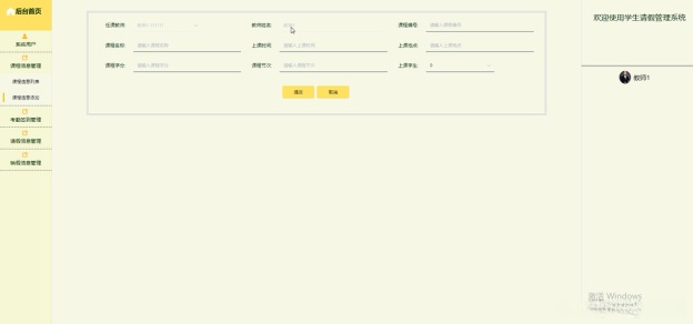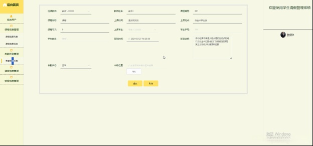 (3)课程信息管理:可以查看到教师用户提交的课程内容,教师添加课程信息,查看学生请假申请情况和考勤签到情况,可通过web端直接为其查询、添加、删除等操作;