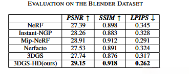 为了保证实验的精度,我们的场景训练设置为30K次迭代,并配置了与3DGS [2]相同的参数设置,使用了NVIDIA RTX 3060显卡。对图像进行了评估,测试指标为PSNR [13],LPIPS [14]和SSIM [15]。这是对每8张图像进行的。分别在针对复杂场景的Blender [16]数据集和Mip-NeRF 360 [17]数据集上评估模型的综合性能。在细节表现方面,表现更为细微。此外,我们给出了定制的3D扩散模型的一些生成结果。这些结果证明了该模型可以生成逼真的图像,为3D先验的应用提供了坚实的基础。