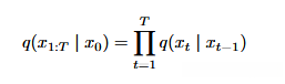 其中,x_{1:T}表示从时间步1到T的所有数据点的序列,q(x_{t} | x_{t-1})表示在给定的时间步t - 1下局域立方态x_{t}在局域立方态x_{t-1}上的条件概率分布。