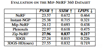 Mip-NeRF 360 [17]数据集的评估被证明更具挑战性,因为该数据集包含复杂的场景,这增加了基线模型发生伪影的可能性。相比之下,本研究中定制的3D扩散模型显示了对局部结构的有效理解,有效地抑制了伪影,提高了重建质量。