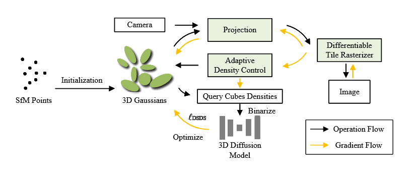 本研究提出了一种基于三维扩散模型的场景优化方法。目标是消除不属于视图的工件,包括漂浮物。从3DGS重建的模型对象中选择局部立方体[2],然后进行预处理,将其输入到训练和定制的3D扩散模型中,完成生成驱动的理解任务。通过密度分数蒸馏分数( Density Score Distillation Score,DSDS ) [4]损失函数对密度分布进行惩罚,消除伪影并优化3DGS [2]重建的模型对象,以确保从2D到3D视图的一致性。