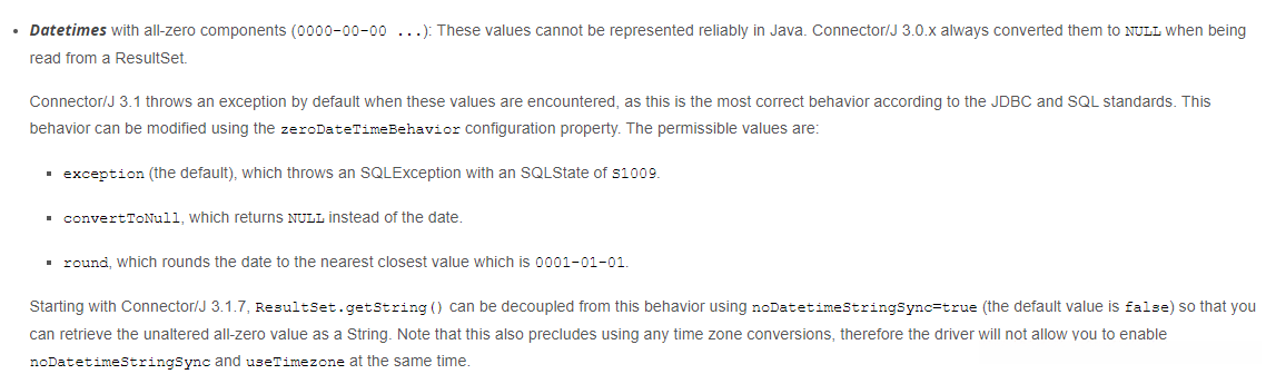 大体意思为:当数据库遇到0000-00-00 00:00:00,这种情况时,会有三种转化,分别是“exception,round,convertTonull”,默认处理情况是转化为exception,就是抛出一个异常。