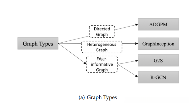 在异构图中存在不同类型的节点。表征不同类型节点最简单的形式是将类型以one-hot向量的方式进行编码,并将其与原始节点的特征向量进行连接。GraphInception模型通过整合metapath(一种基于路径游走的方式)的概念到异构图信息传播机制中。我们可以对每一个邻居节点群体按照其节点类型及距离进行分类。对于每一个邻居节点群体GraphInception将其作为一个同构图中的子图,并将来自不同同构图的信息传播结果相互连接并整合起来作为集合节点进行表征