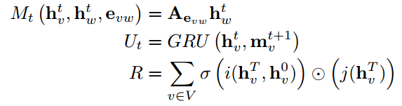 MPNN网络主要由两个部分构成:消息传递过程(Message Passing Process)与读出过程(Readout Process)。具体而言,在经过时间T步骤后,该消息传递过程由message函数Mt与节点更新函数Ut共同作用。经过时间T步骤后,在每个节点的隐状态将通过Mt与Ut生成下一时刻的隐状态值。