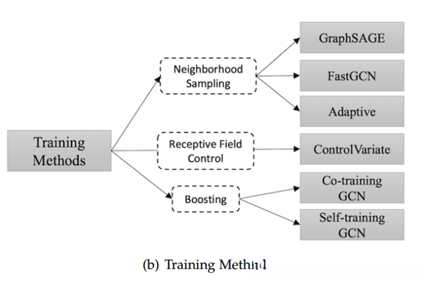 论文中还介绍了几种GNN的训练方法。例如其主要通过节点邻域信息进行聚合GraphSAGE这一类算法具有此特点而FastGCN则通过随机采样部分节点邻居信息来减少计算开销这些训练策略显著提高了模型的整体训练效率