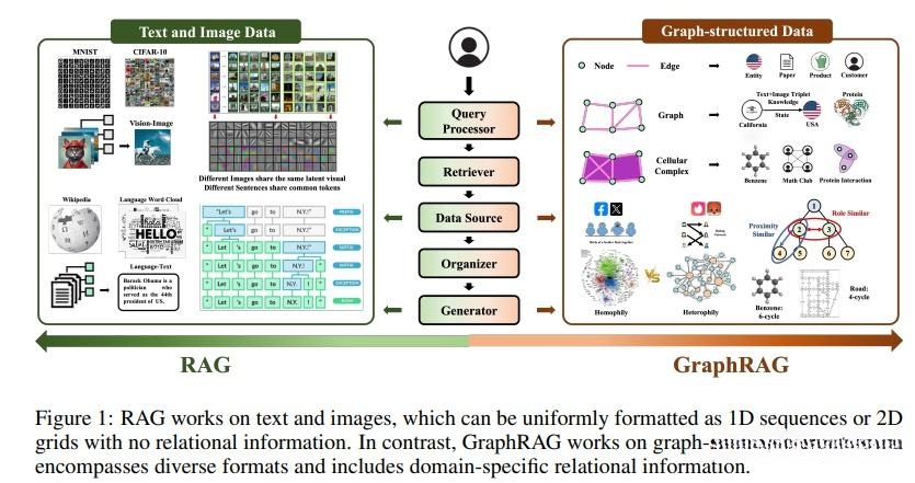 随着大语言模型(LLM)的发展,RAG 被广泛应用于缓解幻觉(hallucination)、提高可解释性、降低隐私风险、确保可靠性以及促进公平性。然而,RAG 主要依赖文本或图像数据,而图数据因其结构化的关系信息,能为 RAG 提供新的优势。例如: